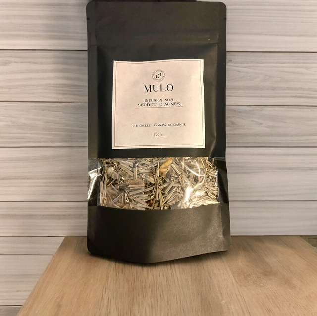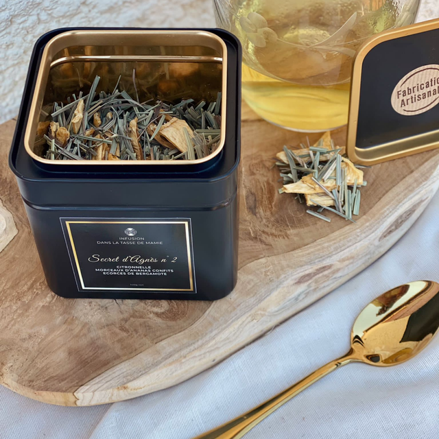 Infusion à base de feuilles de Citronelle de délicieux morceaux d’ananas Pain de sucre du Bénin et de copeaux de bergamote séchés.